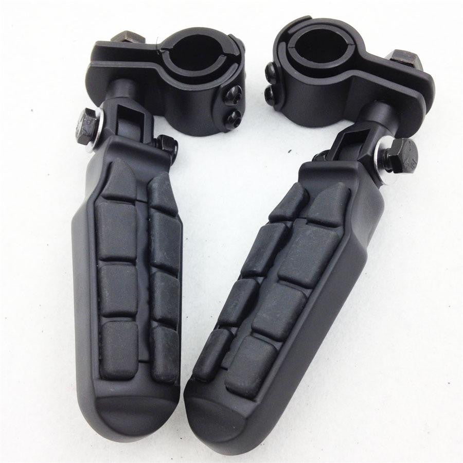 These Highway pegs allow riders a range of adjustment that is not possible with other clamp-on style highway pegs. The offset can be rotated 360?? in a 7"diameter circle to accommodate tall ,short ,or averafe heights riders.These can be installed on any round tubing (frames or engine guards),but it is important to keep in mind that the footpeg itself will end up perpendicular to the bar to which it is mounted.