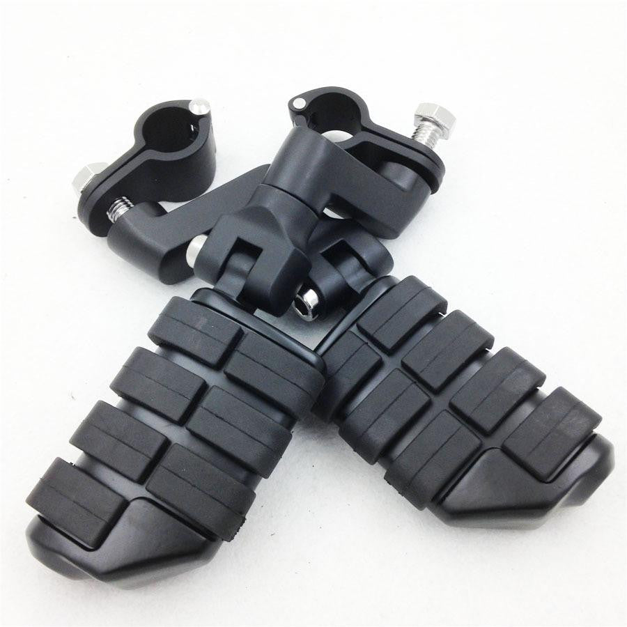 These Highway pegs allow riders a range of adjustment that is not possible with other clamp-on style highway pegs. The offset can be rotated 360?? in a 7"diameter circle to accommodate tall ,short ,or averafe heights riders.These can be installed on any round tubing (frames or engine guards),but it is important to keep in mind that the footpeg itself will end up perpendicular to the bar to which it is mounted.